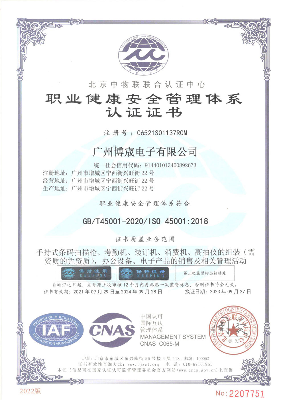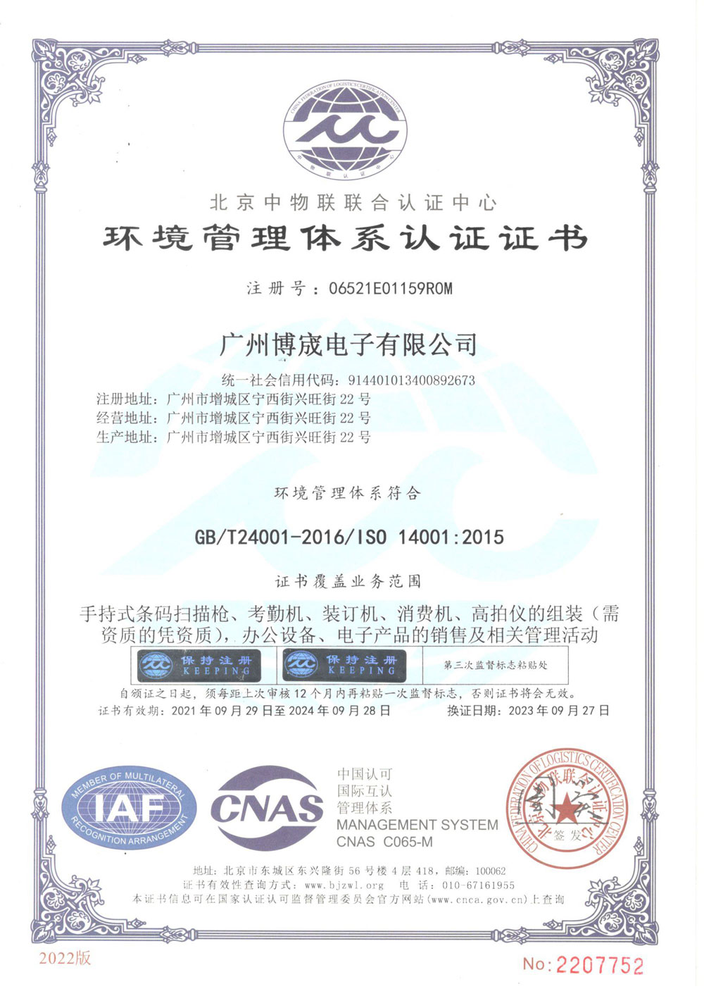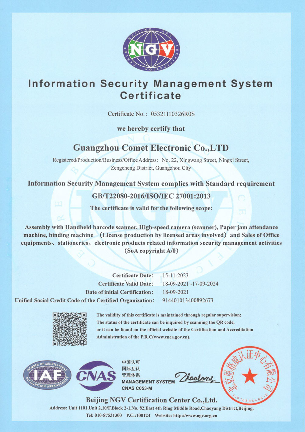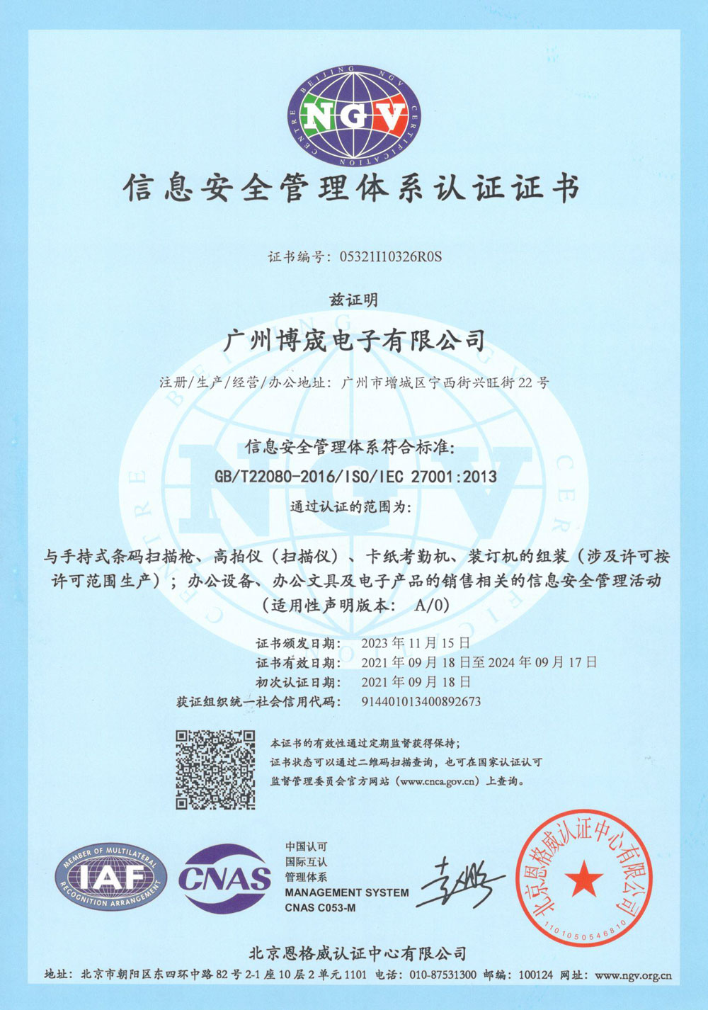 信息安全管理體系認(rèn)證證書(shū)