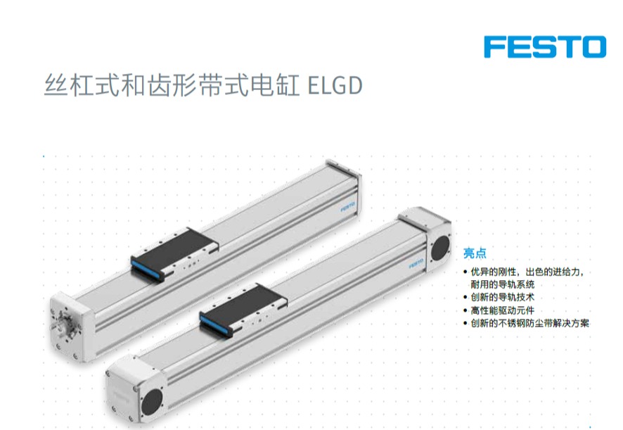 功能強勁的 ELGD 電缸系列可選: ELGD-BS 絲杠式電缸和 ELGD-TB 齒形帶式電缸,可順暢用于機電自動化技術(shù)領(lǐng)域的各種應用。該產(chǎn)品組合種類繁多,提供標準和寬款兩種型號,其下采用不同規(guī)格,不但剛性強、進給力大,導軌系統(tǒng)還具有較長的使用壽命。