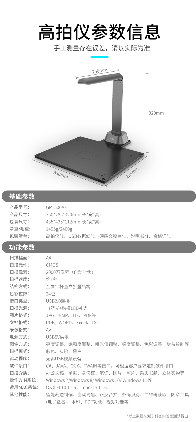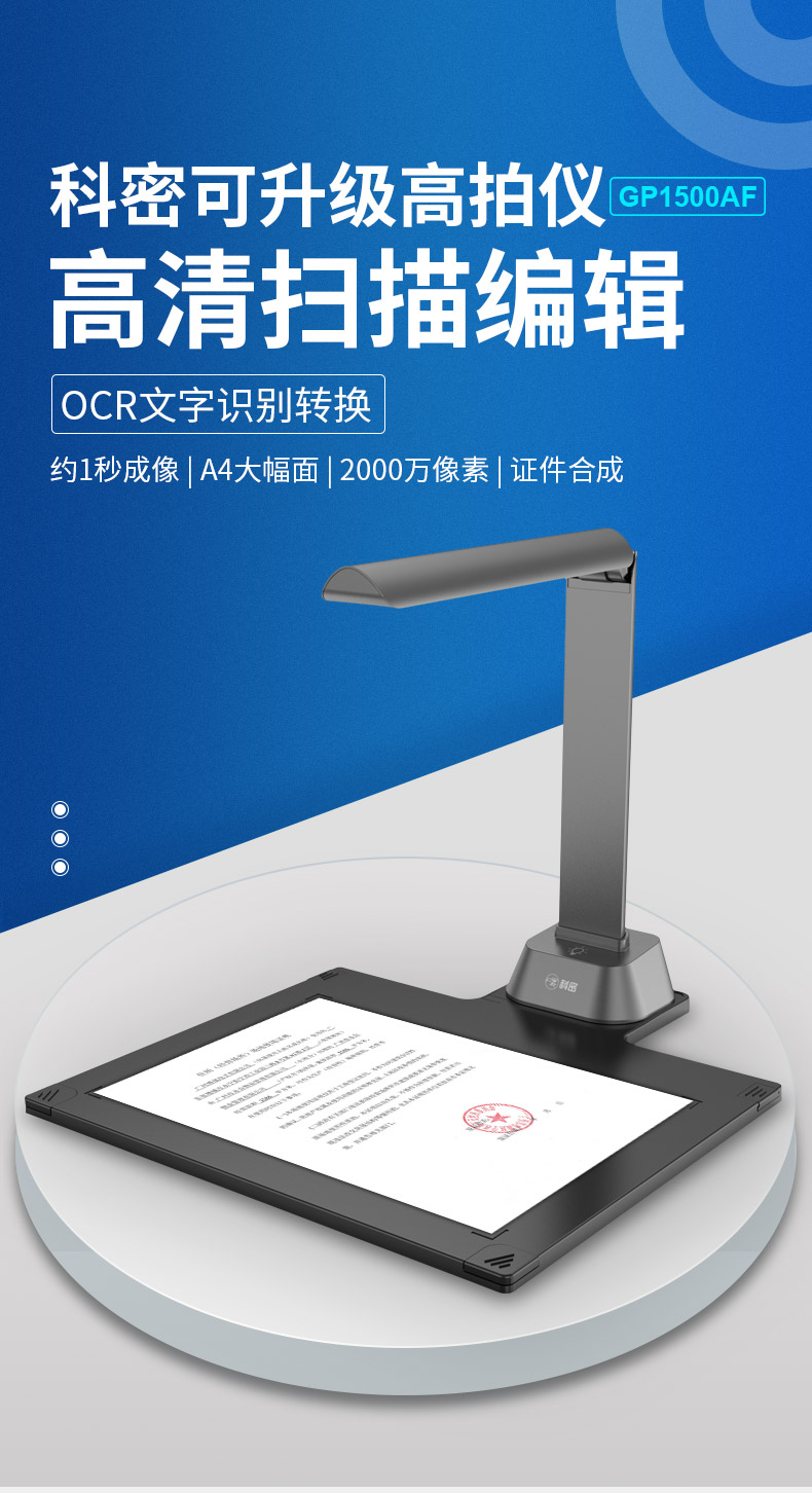科密(comet) GP1500AF 高拍儀 2000萬像素 可在線升級掃描儀 A4文件PDF合成 OCR識別 適配國產系統