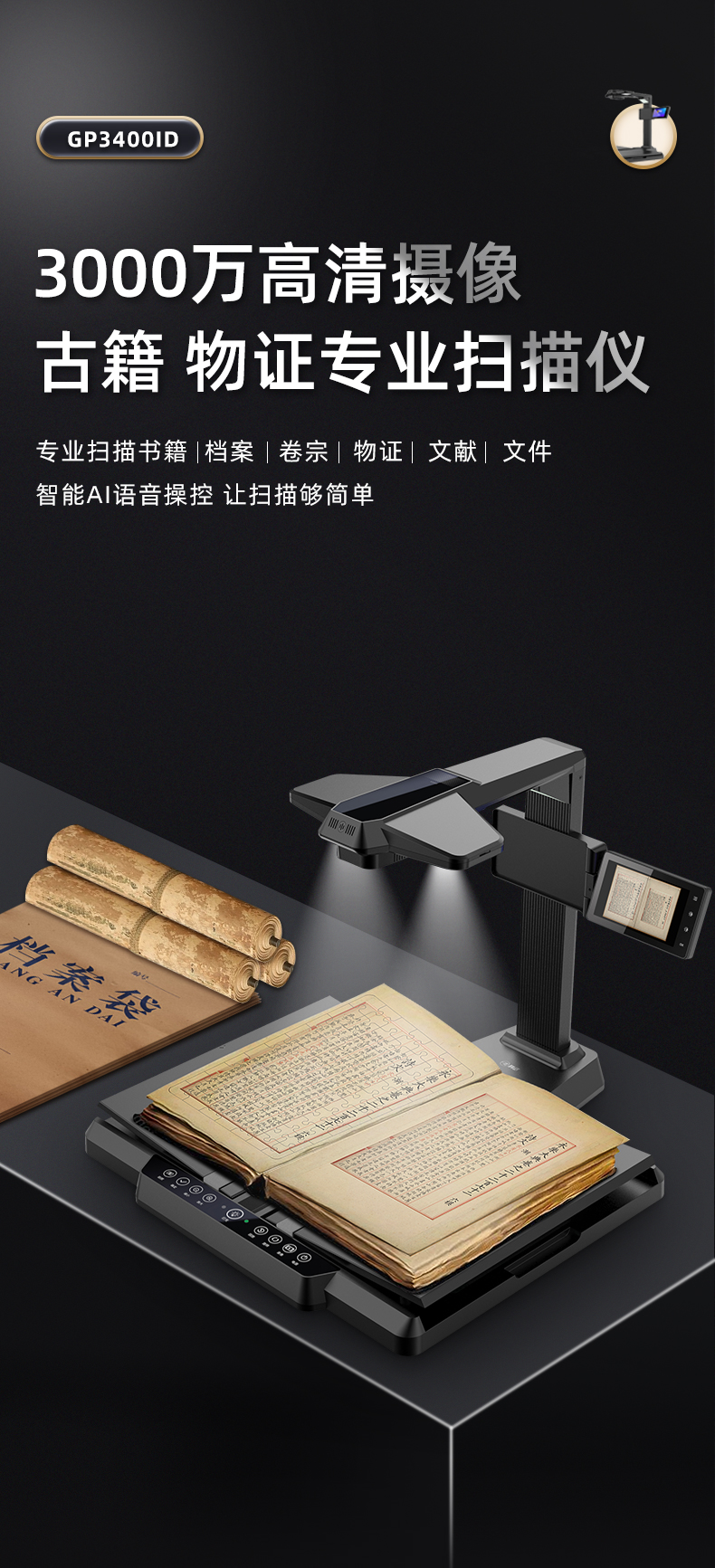 科密 GP3400ID 3000萬高清像素高拍儀 書籍成冊掃描曲面展平 A3A4古籍物證檔案掃描儀