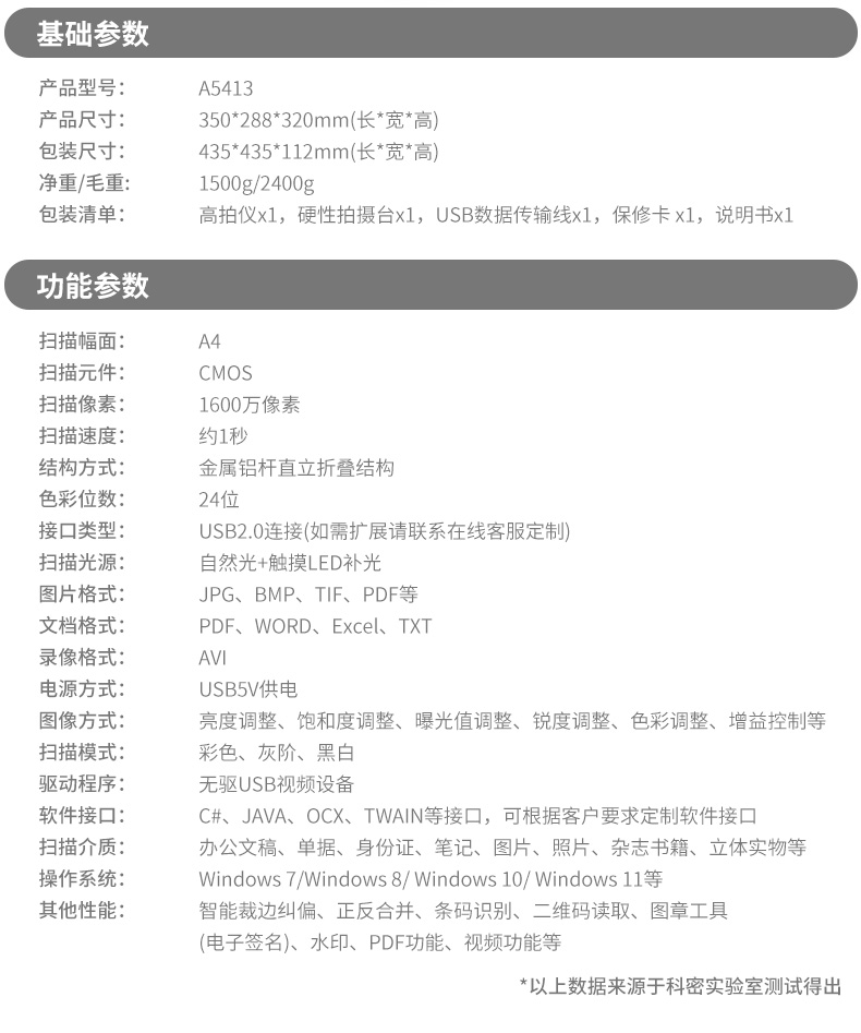 科密(comet) 科密A5413高拍儀 1600萬像素 自動(dòng)對焦 商用辦公文件文檔試卷資料 掃描儀